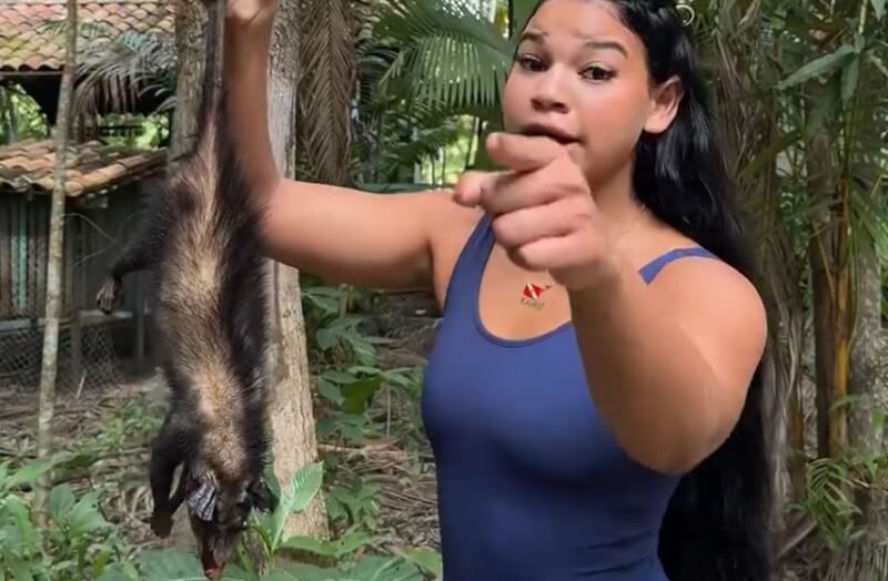 De acordo com a influencer, no Pará os ribeirinhos comem facilmente mucura, que é uma espécie de gambá, que gosta de se alimentar de roedores e aves de pequeno porte, rãs, lagartos, insetos, caranguejos e frutos.