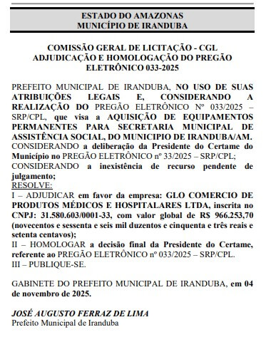 O que chama atenção nesta contratação, além do alto valor pago pela Prefeitura de Iranduba a empresa GLO COMERCIO DE PRODUTOS MÉDICOS E HOSPITALARES LTDA, o contrato não informa quais seriam esses equipamentos permanentes que estão sendo adquiridos pela gestão municipal e nem o tempo de entrega dos mesmos.