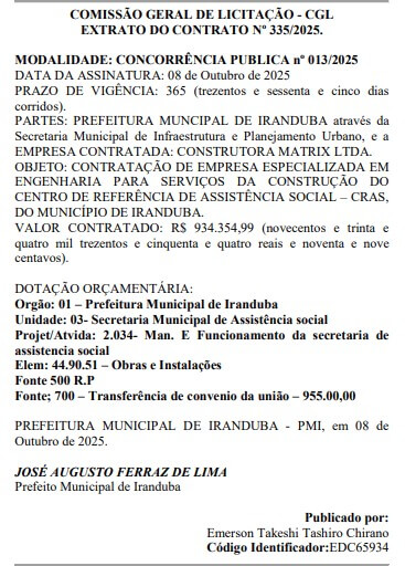 De acordo com o Diário Oficial dos Municípios (DOM) desta quarta-feira (15/10), o prefeito Augusto Ferraz contratou a empresa CONSTRUTORA MATRIX LTDA pelo valor total de R$ 934.354,99 (novecentos e trinta e quatro mil trezentos e cinquenta e quatro reais e noventa e nove centavos).