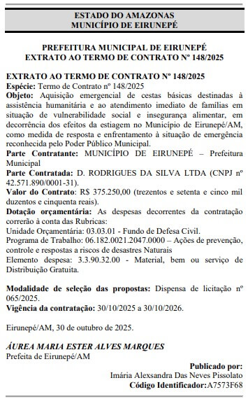A prefeita Professora Áurea Marques (MDB), vai gastar mais de R$ 370 mil reais na compra de cestas básicas, para segundo ela, atender famílias em situação de vulnerabilidade social e insegurança alimentar, em decorrência dos efeitos da estiagem no município de Eirunepé.