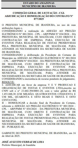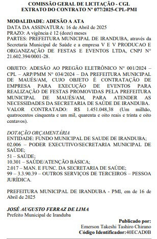O contrato não especifica qual será o serviço prestado pela empresa de eventos, mas em meio a crise de saúde sofrida no município de Iranduba, é incomum que a Secretaria de Saúde que tem como titular a primeir-dama do município Luana Ferraz, contrate uma empresa de eventos para fazer festas na Semsa.