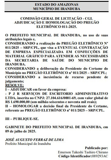 De acordo com o Diário Oficial dos Municípios (DOM), a empresa P. J. R. SERVIÇOS DE ESCRITÓRIO ADMINISTRATIVO LTDA, vai receber da Prefeitura de Iranduba o valor total de R$ 1.690.000,00 (um milhão seiscentos e noventa mil reais), para prestar o serviço de confecção de material gráfico para atender a Semsa, cujo a titularidade da pasta é de Luana Ferraz, primeira-dama e pré-candidata a deputada estadual nas próximas eleições.