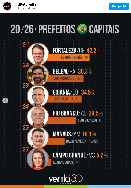 O prefeito mais bem pontuado na pesquisa do Instituto Veritá é o prefeito Léo Moraes (Podemos), de Porto Velho no estado de Rondônia, com 94,5% de aprovação. David ficou em 25º colocado, com apenas 18,1% de aprovação.