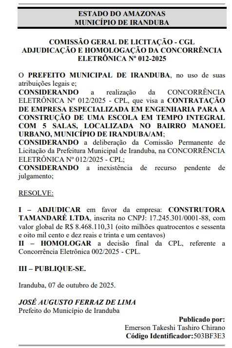 Augusto Ferraz é investigado pelo Tribunal de Contas do Estado do Amazonas (TCE-AM) por supostas irregularidades no Pregão Eletrônico nº 12/2025.