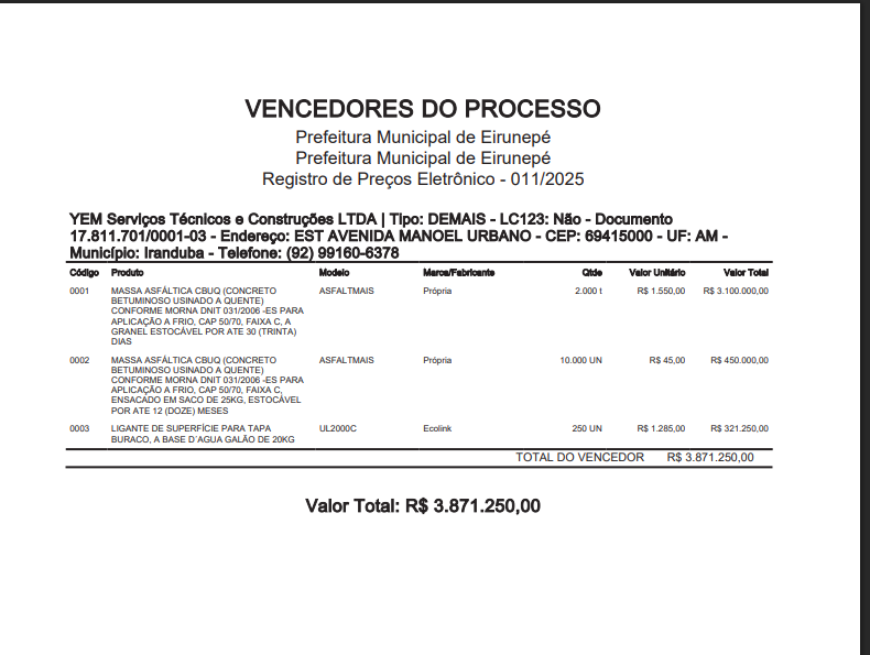 De acordo com informações no Portal da Transparência da Prefeitura de Eirunepé, Áurea Marques gastou R$ 3.871.250,00 (três milhões, oitocentos e setenta e um mil e duzentos e cinquenta reais), na empresa YEM SERVIÇOS TÉCNICOS E CONSTRUÇÕES LTDA, para o serviço de asfaltamento de Eirunepé, mas isso não condiz com a realidade.