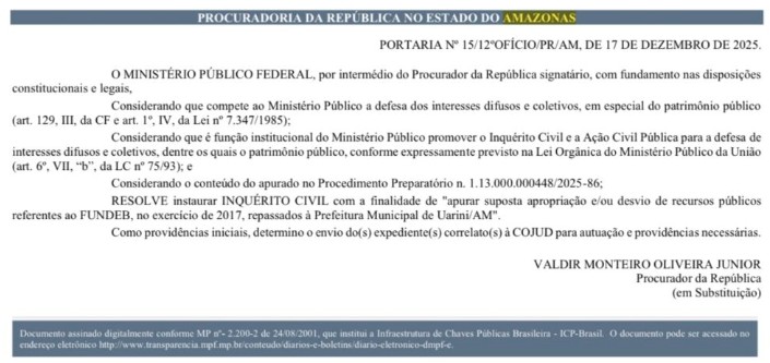 O procurador da República em substituição, Valdir Monteiro Oliveira Junior, foi quem formalizou a instauração do inquérito civil para apurar a suposta apropriação e desvio de recursos públicos do Fundeb em Uarini.
