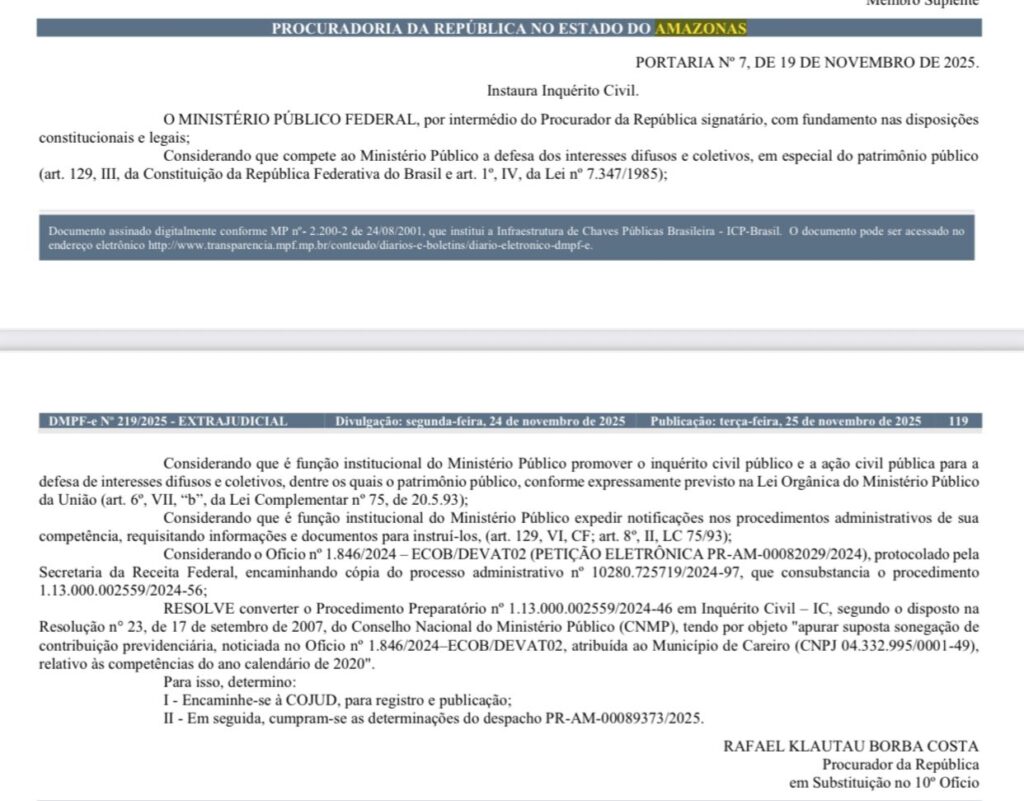 O Ministério Público Federal (MPF), vai investigar o ex-prefeito do Careiro Castanho Nathan Macena (Republicanos), por sonegação de contribuições previdenciárias, correspondentes ao ano de 2020. O caso deve ser investigado a pedido do procurador da República Rafael Klautau Borba Costa.