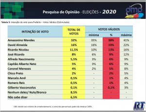 A DMP/Tiradentes ouviu 1.001 pessoas entre os dias 19 e 22 de outubro, em Manaus. A margem de erro é de 3,2% e nível de confiança da pesquisa de 95%. A pesquisa foi registrada no TSE com o número AM-09146/2020.