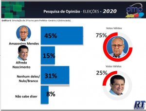 Contra o Coronel Menezes (Patriota), Amazonino teria 65% contra 35%. Em uma disputa com Capitão Alberto Neto (Republicanos), Mendes teria 64% dos votos válidos. Se a disputa no segundo turno fosse contra Ricardo Nicolau, Amazonino teria 61% contra 39% de Ricardo. Amazonino também venceria o candidato do Avante, que tem Marcos Rotta (Democratas), atual vice-prefeito da cidade, como companheiro de chapa. Amazonino teria 54% dos votos válidos, contra 46% do adversário.