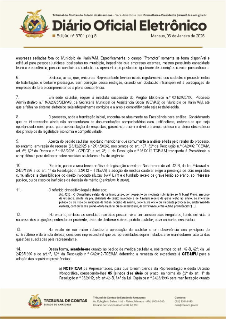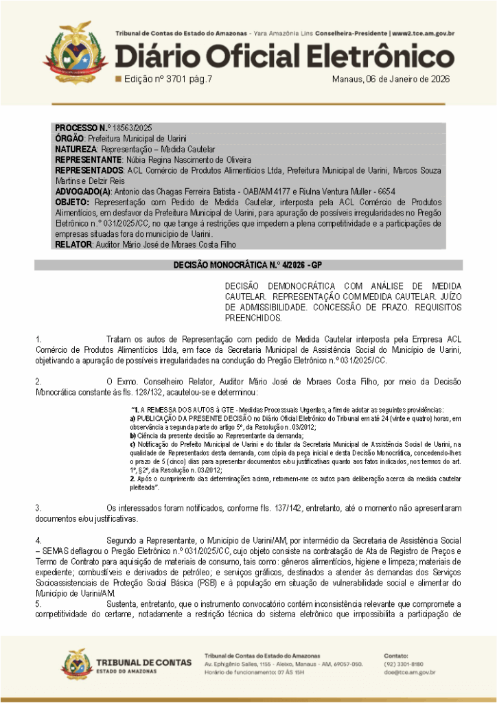 Irregularidades em uma licitação fez com que o Tribunal de Contas do Estado do Amazonas (TCE-AM), desse cinco dias para que o prefeito Marcos Martins (UB), apresente esclarecimentos sobre o Pregão Eletrônico nº 031/2025-CC feito pela Secretaria Municipal de Assistência Social (Semas) de Uarini.