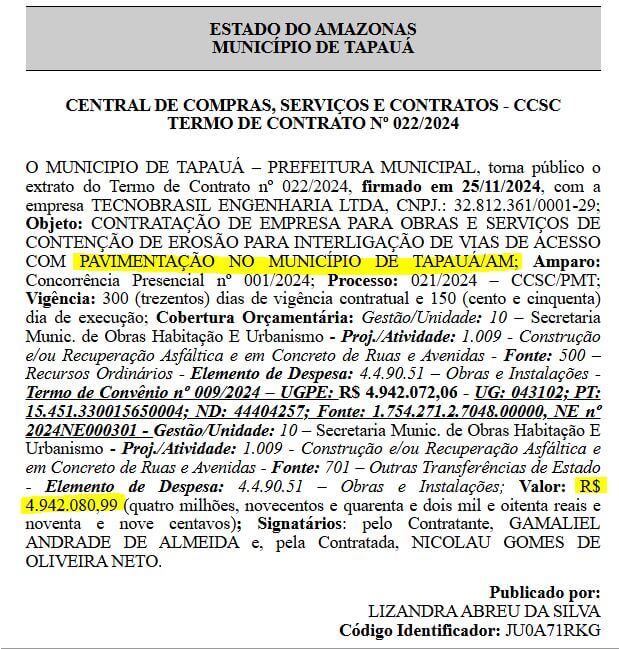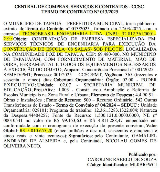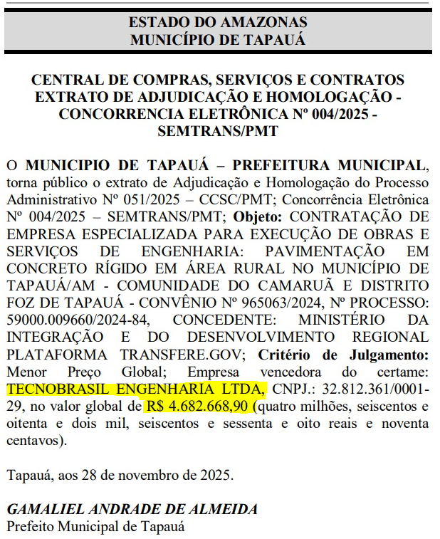 O que chama atenção nesta contratação é que Gamaliel Andrade parece gostar da empresa TECNOBRASIL ENGENHARIA LTDA, que já havia sido contratada para outros serviços dentro do município de Tapauá.