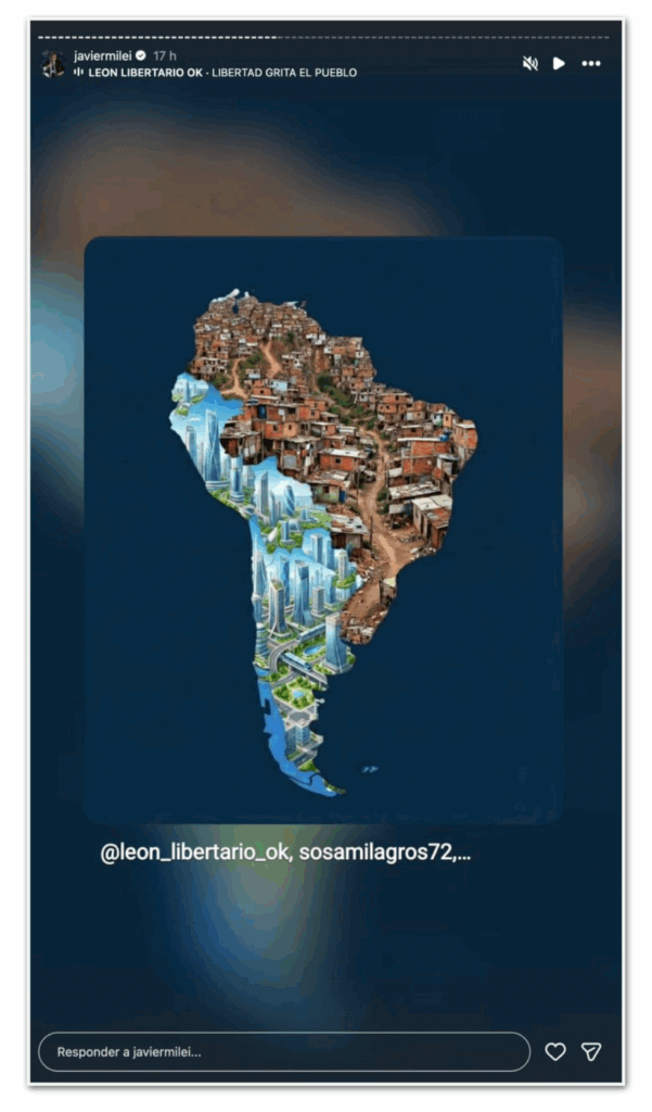 Na imagem compartilhada por Milei, o mapa sul-americano é dividido, colocando uma grande favela representada por Brasil, Uruguai, Venezuela, Guiana, Suriname, Guiana Francesa e Colômbia, de um lado e do outro lado, as áreas futuristas cobrem os mapas de Argentina, Chile, Paraguai, Equador, Bolívia e Peru.