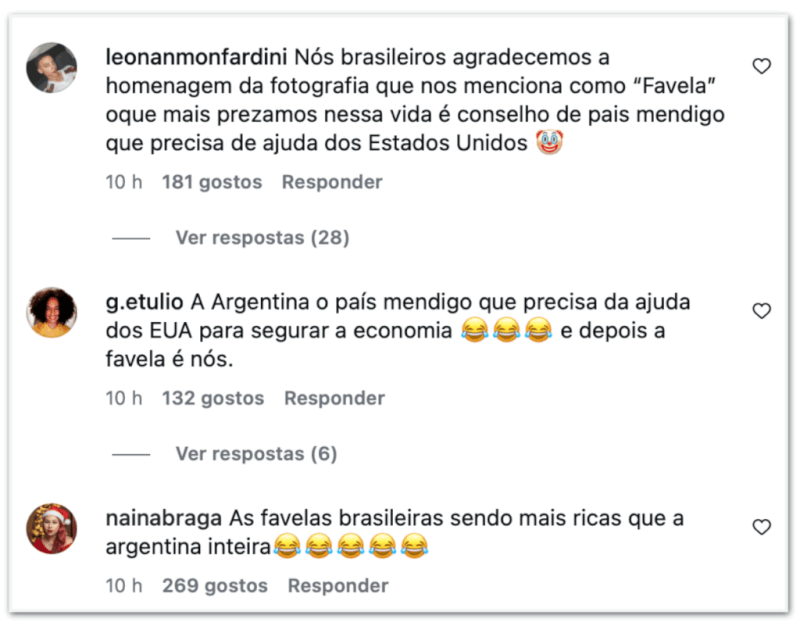 “A Argentina [é] o país mendigo que precisa da ajuda dos EUA para segurar a economia e depois a favela ‘é nós'”, escreveu um internauta falando sobre o pedido de ajuda de Milei ao presidente Donald Trump.