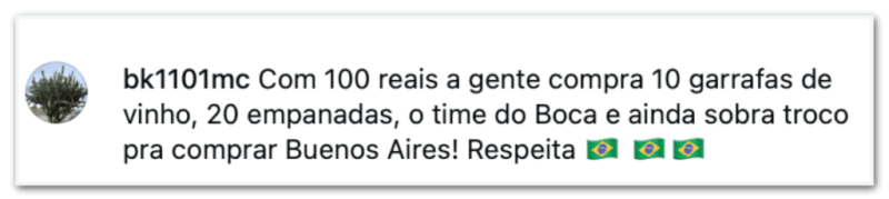 “Com 100 reais a gente compra 10 garrafas de vinho, 20 empanadas, o time do Boca e ainda sobra troco pra comprar Buenos Aires! Respeita”, disse outro.