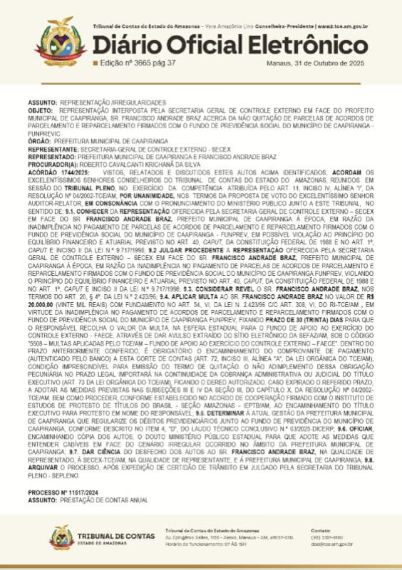 O ex-prefeito Francisco Andrade Braz, mais conhecido como “Tico Braz” (UB), foi multado pelo Tribunal de Contas do Estado do Amazonas (TCE-AM), por não quitar parcelas do acordo firmado com o Fundo de Previdência Social do Município de Caapiranga (FUNPREVIC).