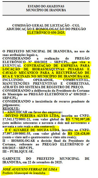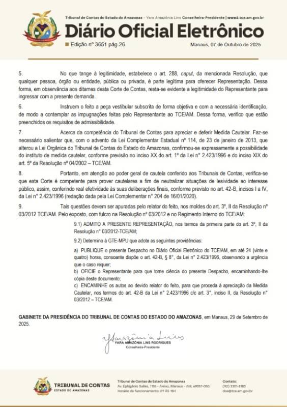 Por conta de suspeitas de irregularidades em uma licitação de aluguel de equipamentos pesados para asfaltar ruas e vicinais de Iranduba, o Tribunal de Contas do Estado do Amazonas (TCE-AM), acatou um pedido de Representação com Medida Cautelar para investigar o prefeito Augusto Ferraz (UB), por conta de irregularidades no Pregão Eletrônico nº 030/2025-pmi/iranduba.