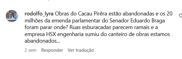 O homem denunciou que as obras prometidas no Distrito do Cacau Pirêra, que teve uma emenda parlamentar no valor de R$ 20 milhões, com a contratação da empresa H.S.X ENGENHARIA LTDA, mas que ficou abandonado logo após as eleições de 2024.