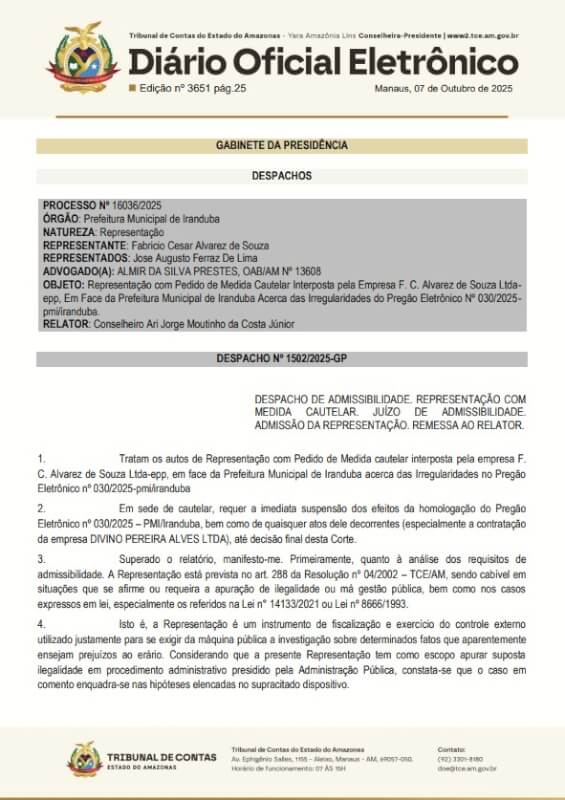 “Em sede de cautelar, requer a imediata suspensão dos efeitos da homologação do Pregão Eletrônico nº 030/2025 – PMI/Iranduba, bem como de quaisquer atos dele decorrentes (especialmente a contratação da empresa DIVINO PEREIRA ALVES LTDA), até decisão final desta Corte”, diz um trecho do documento.