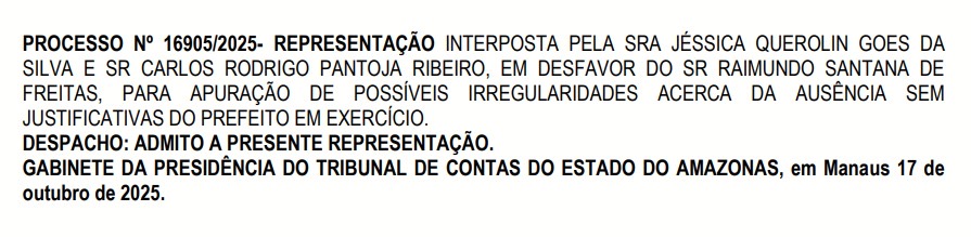 O processo pede ao TCE-AM que investigue possíveis irregularidades e se houve descumprimento das leis. O Tribunal de Contas do Estado do Amazonas admitiu a representação e vai investigar a ausência do gestor municipal durante os dias já citados.