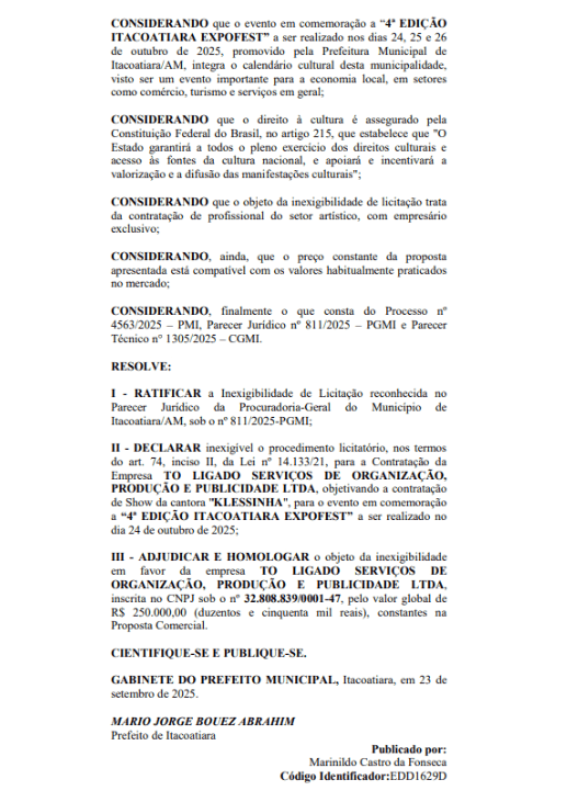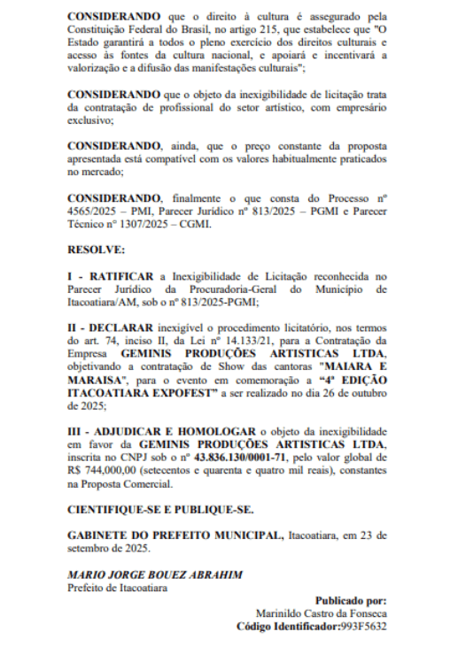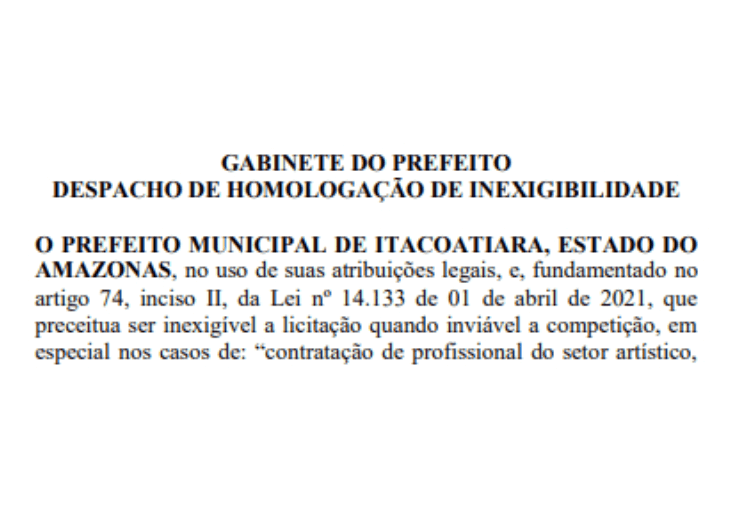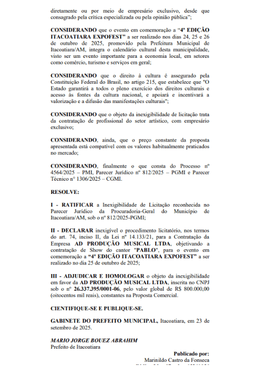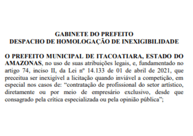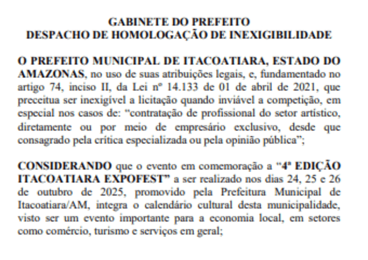 A Prefeitura de Itacoatiara gastou mais de R$ 1,794 milhões na contratação de artistas nacionais, para o Expofest 2025, realizado nos dias 24, 25 e 26 de outubro deste ano, que contou com shows de Klessinha (R$ 250 mil), Pablo (R$ 800 mil) e Maiara & Maraisa (R$ 744 mil).