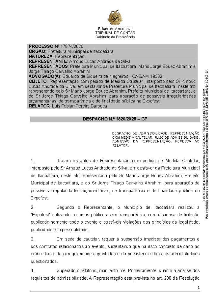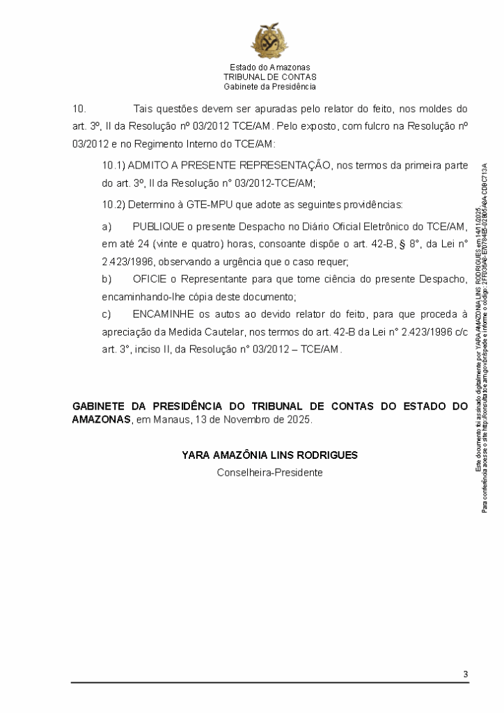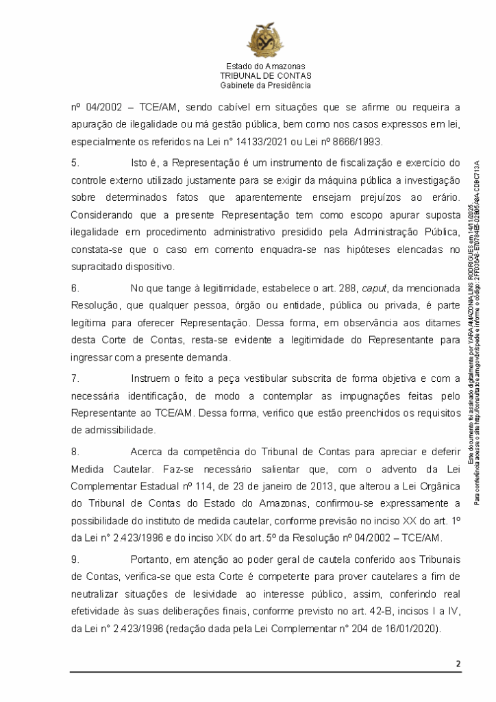 A presidente do TCE-AM, conselheira Yara Lins, reconheceu que a denúncia preenche os requisitos de admissibilidade previstos na Resolução nº 04/2002, que disciplina as representações ao Tribunal. Segundo a conselheira, a cautelar é essencial para evitar prejuízos ao interesse público e garantir a efetividade das decisões finais da Corte.